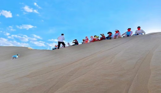 모래 썰매 체험: 인컨타라 사막의 모래 언덕에서 즐기는 아찔한 모래 썰매 체험! 계단으로 언덕을 올라가서 썰매를 타고 내려오며 보다 편리하고 스릴 넘치게 즐길 수 있습니다.